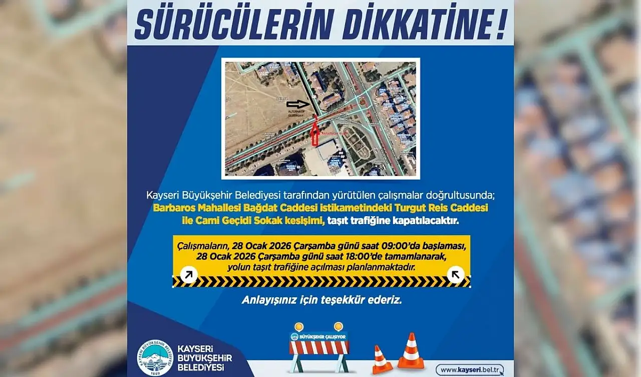 Büyükşehir Belediyesi tarafından yapılan duyuruda, “Kayseri Büyükşehir Belediyesi tarafından yürütülen çalışmalar doğrultusunda; Barbaros Mahallesi Bağdat Caddesi istikametindeki Turgut Reis Caddesi ile Cami Geçidi Sokak kesişimi, taşıt trafiğine kapatılacaktır” ifadelerine yer verilerek vatandaşlar bilgilendirildi.