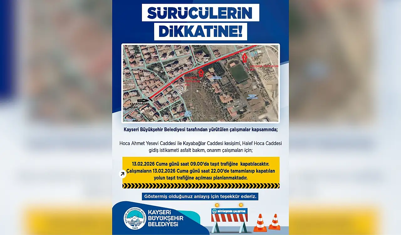 Kayseri Büyükşehir Belediyesi, asfalt bakım ve onarım çalışmaları kapsamında, 13 Şubat Cuma günü kentin önemli arterlerinden birinde geçici süreyle trafik kısıtlamasına gidileceğini duyurdu.