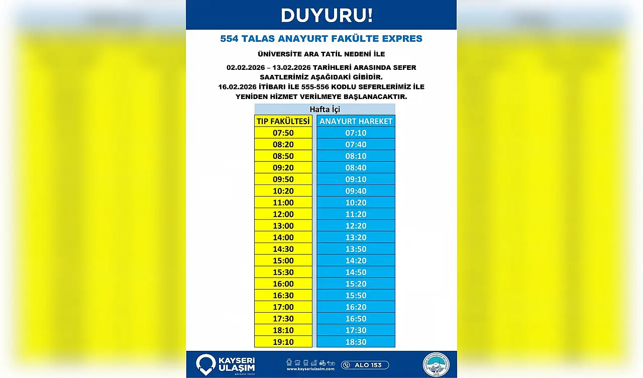 Yapılan yeni düzenlemeler, 31 Ocak 2026 tarihi itibariyle geçerli olacak. Özellikle üniversite öğrencilerinin ve Talas bölgesinde yaşayan vatandaşların yoğun olarak kullandığı ekspres hatlardaki bu değişikliklerin, ulaşım sürelerini etkilemesi bekleniyor. Yolcuların mağduriyet yaşamamaları adına güncel sefer saatlerini ve detaylı güzergah bilgilerini kurumun resmi kanallarından kontrol etmeleri istendi.