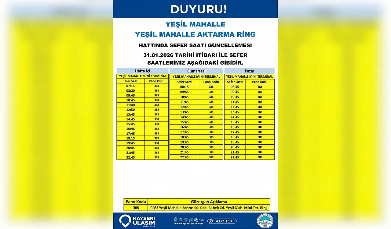 Kayseri Ulaşım A.Ş., şehir içi toplu taşıma konforunu artırmak ve verimliliği sağlamak amacıyla bazı hatlarda güncellemeye gitti. 30 Ocak 2026 tarihinde yapılan açıklamaya göre; Talas Anayurt Fakülte Expres ve Yeşil Mahalle Ring hatlarında sefer saatleri ve güzergahlar yeniden düzenlendi.