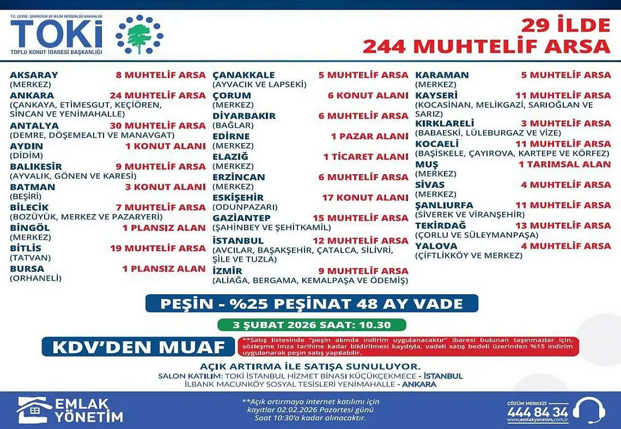 TOKİ Kayseri'nin yanı sıra Aksaray, Ankara, Antalya, Aydın, Balıkesir, Batman, Bilecik, Bingöl, Bitlis, Bursa, Çanakkale, Çorum, Diyarbakır, Edirne, Elazığ, Erzincan, Eskişehir, Gaziantep, İstanbul, İzmir, Karaman, Kırklareli, Kocaeli, Muş, Sivas, Şanlıurfa, Tekirdağ ve Yalova illerinde bulunan arsaların satış müzayedesini gerçekleştirecek. Müzayede 3 Şubat 2026 tarihinde saat 10:30'da yapılacak.