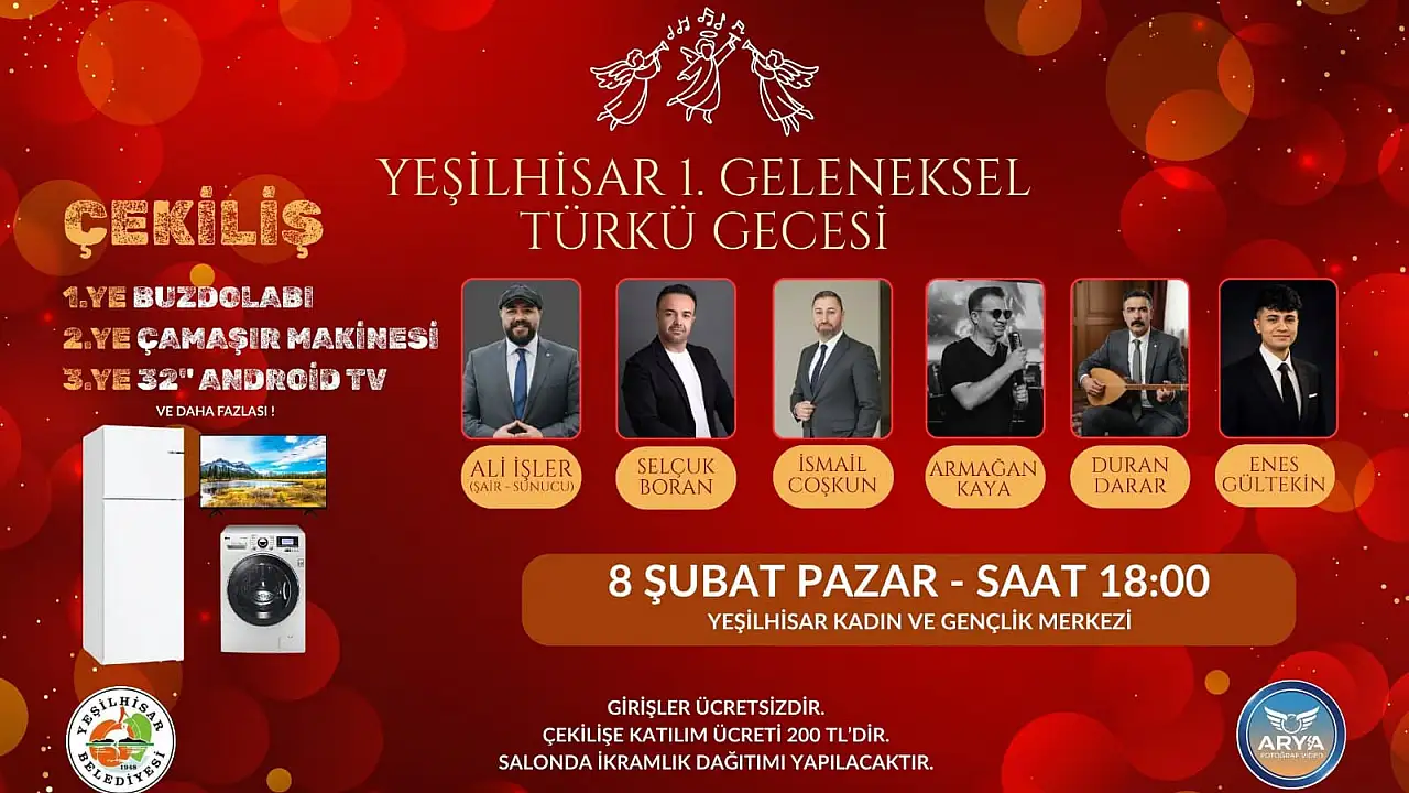 Yeşilhisar, kültürel etkinliklerine bir yenisini daha ekliyor. Yeşilhisar'da organize edilen "1. Geleneksel Türkü Gecesi", 8 Şubat Pazar günü saat 18.00’de Yeşilhisar Kadın ve Gençlik Merkezi’nde gerçekleştirilecek.