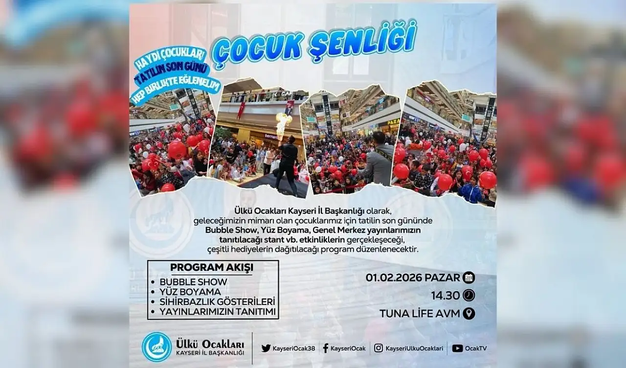 Ülkü Ocakları Kayseri Başkanı Halit Yağmur sosyal medya hesabından yaptığı paylaşım ile vatandaşlara çağrı yaptı. Yarıyıl tatilinin son gününde çocuklar için şenlik yapılacağını duyurdu.
