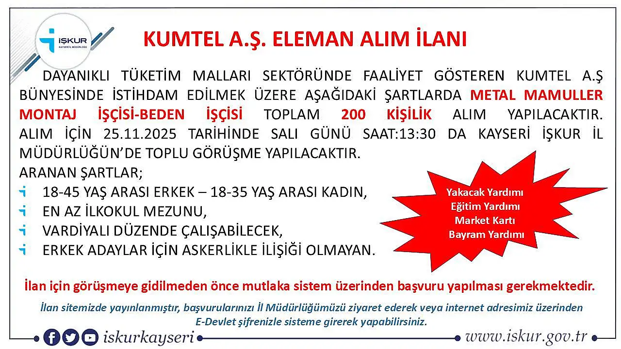 Tüm Türkiye’de olduğu gibi Kayseri’de de işsizlik sorunu sürüyor. Kayseri İŞKUR ise iş arayanlar ile işverenleri buluşturmaya devam ediyor. Bu çerçeve İŞKUR tarafından yapılan paylaşımda, dayanıklı tüketim malları sektöründe faaliyet gösteren Kumtel A.Ş. bünyesinde istihdam edilmek üzere personel alımı yapılacağı açıklandı.