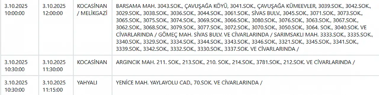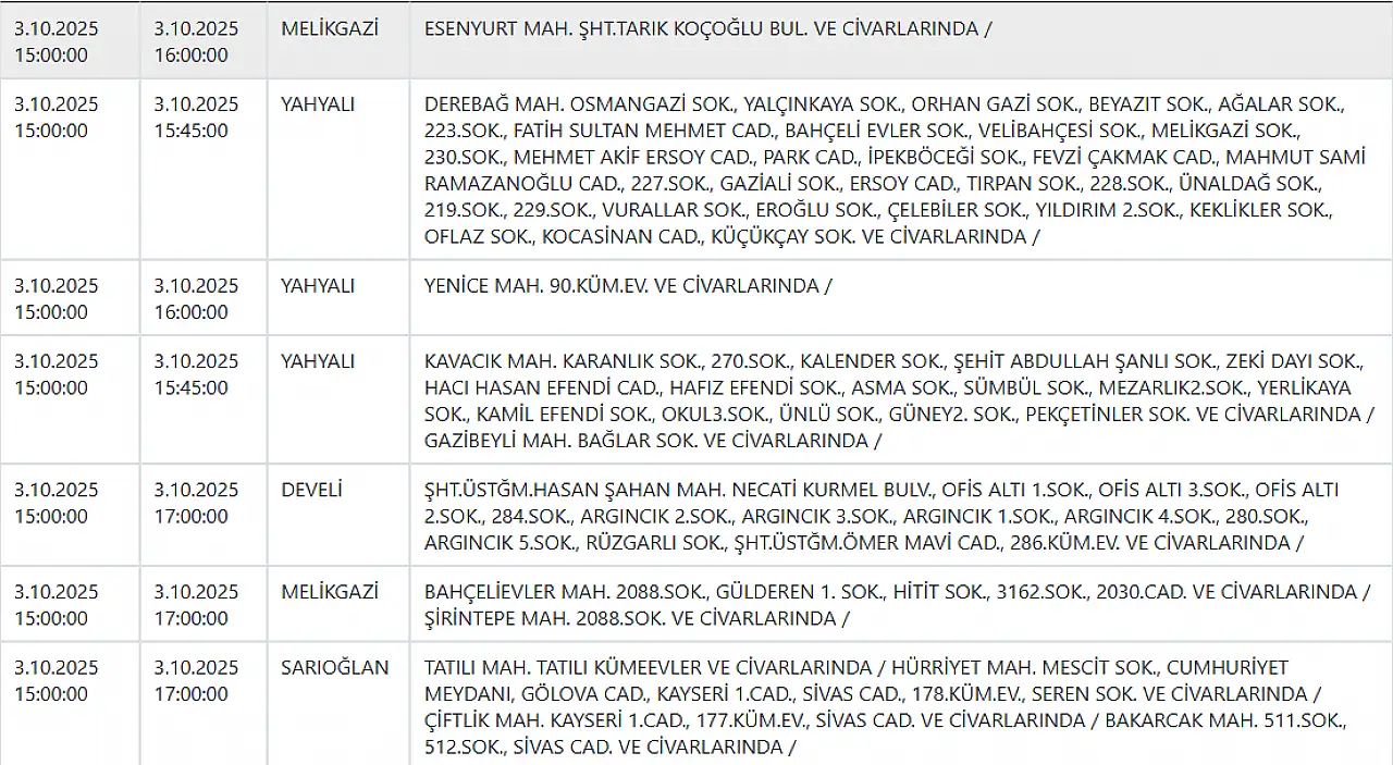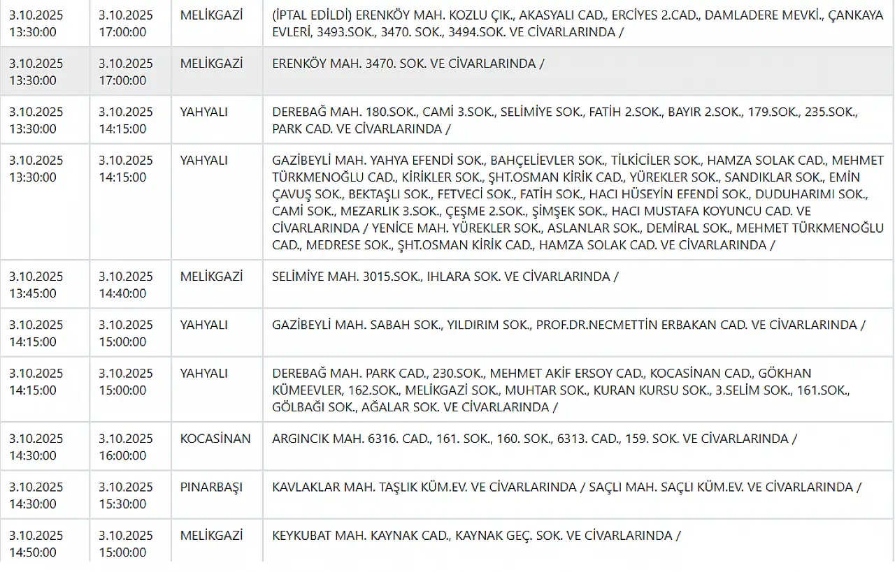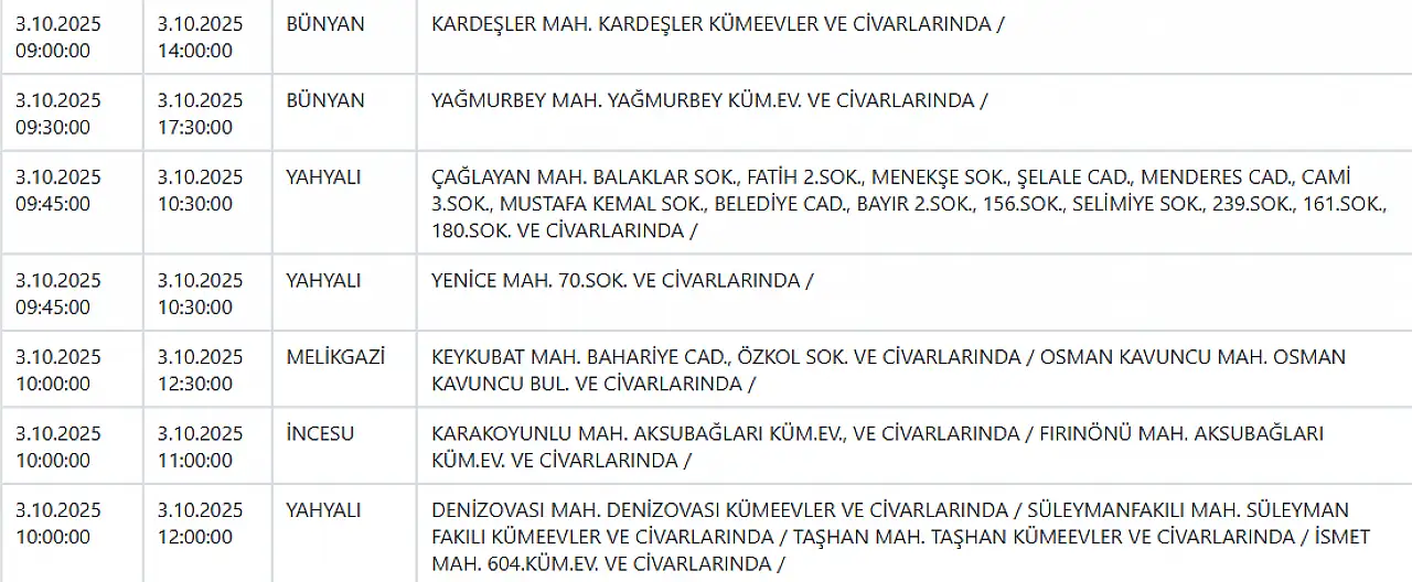 Kayseri ve Civarı Elektrik Türk Anonim Şirketi (KCETAŞ), Kayseri'nin birçok ilçesinde sabah saatlerinden itibaren elektrik kesintisi yaşanacağını paylaştı. Detaylar Kayseri Olay haber merkezince derlediğimiz Kayseri haber bülteninde.