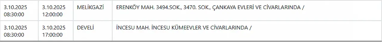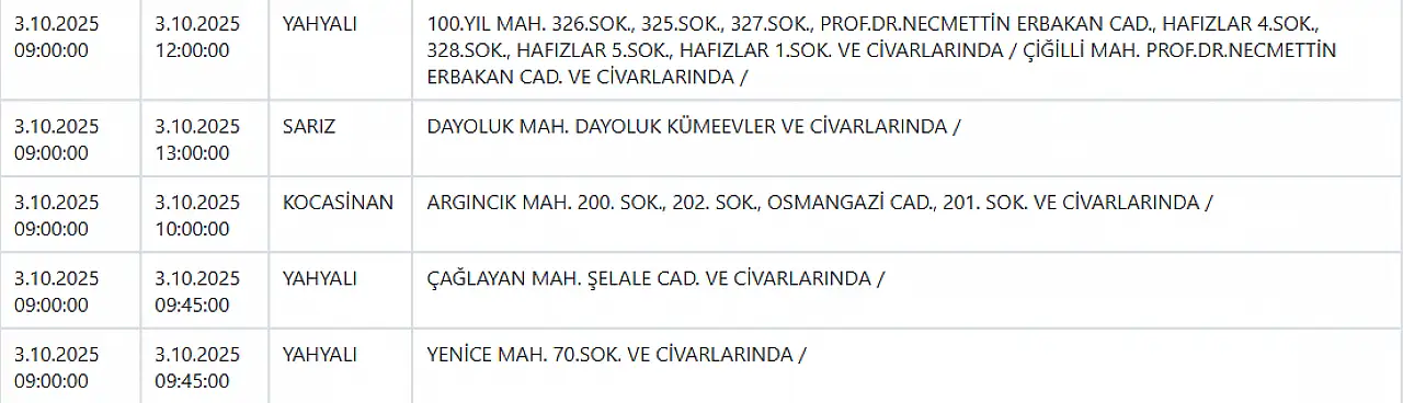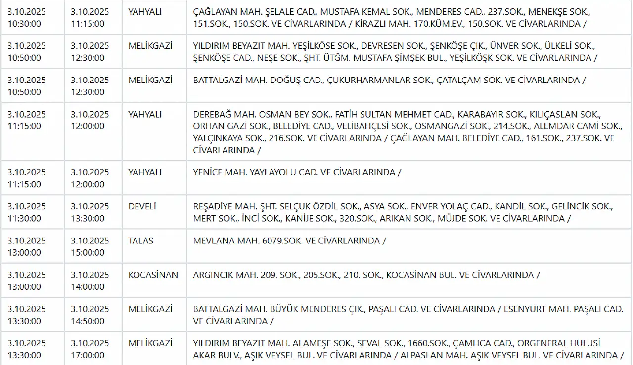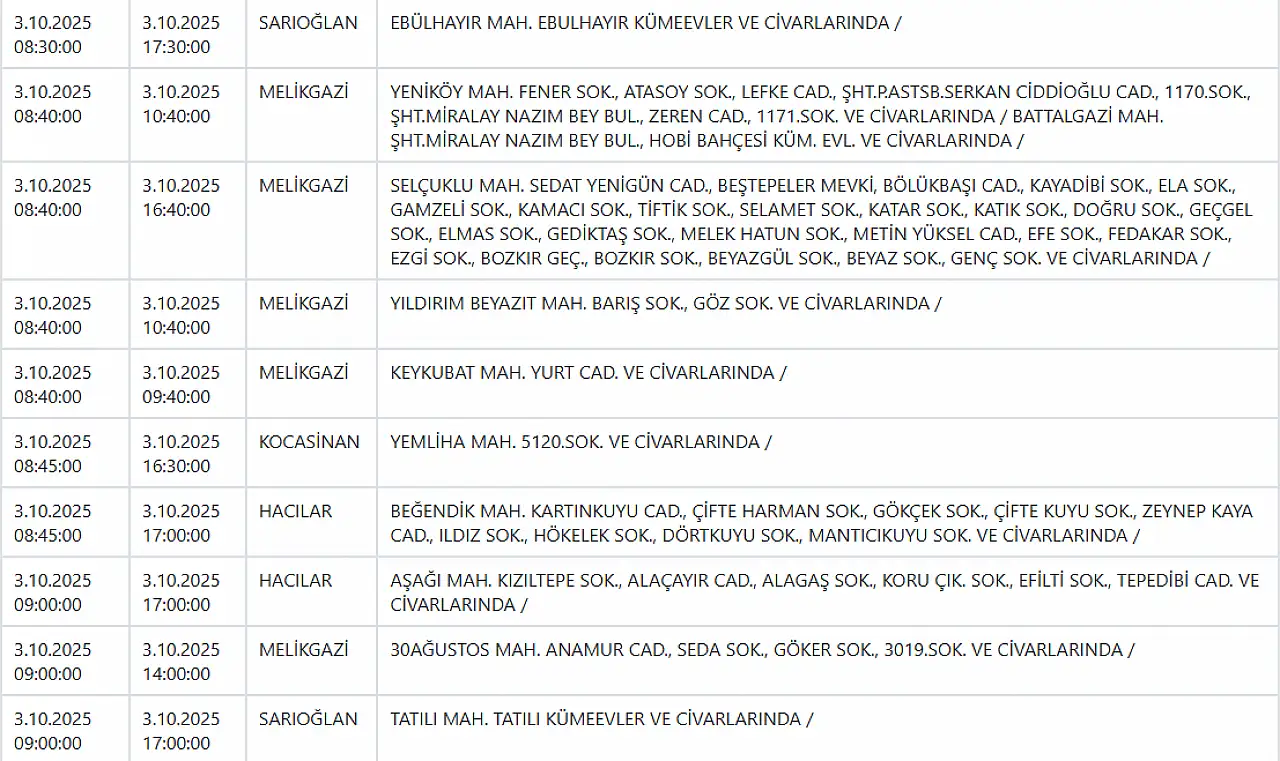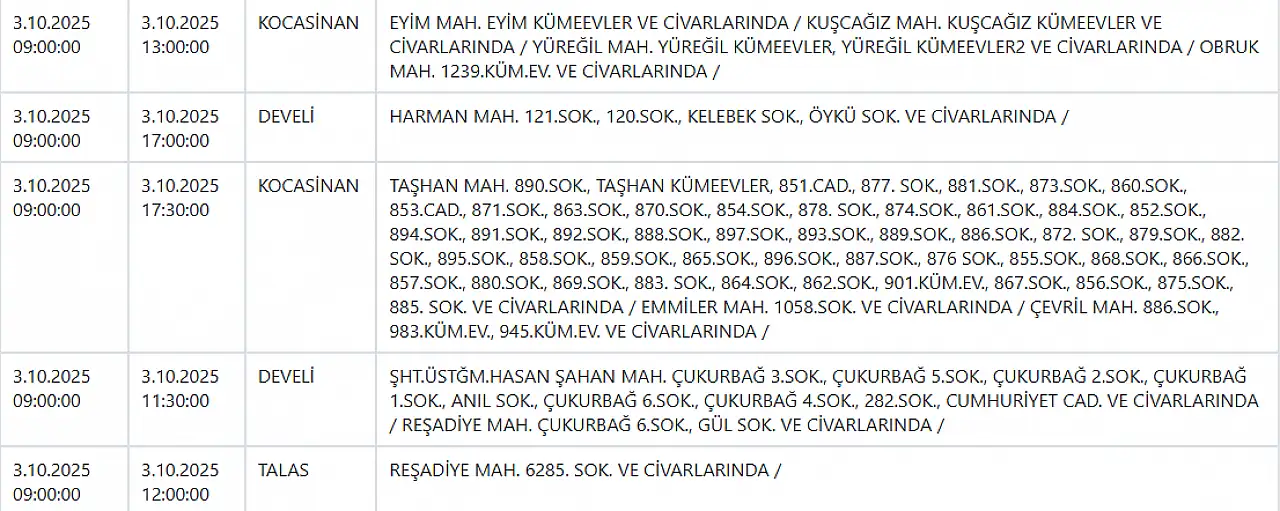 Kayseri ve Civarı Elektrik Türk Anonim Şirketi (KCETAŞ), Kayseri'nin birçok ilçesinde sabah saatlerinden itibaren elektrik kesintisi yaşanacağını paylaştı. Detaylar Kayseri Olay haber merkezince derlediğimiz Kayseri haber bülteninde.