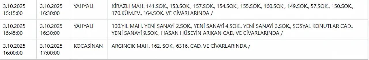 Kayseri ve Civarı Elektrik Türk Anonim Şirketi (KCETAŞ), vatandaşları yaşanacak elektrik kesintilerine ilişkin uyardı. Kayseri’nin bazı ilçelerinde ve mahallelerinde planlı elektrik kesintisi yapılacak. Vatandaşların mağduriyet yaşamaması adına KCETAŞ tarafından kesinti yapılacak adresler paylaşılmaya devam ediyor. Bu çerçevede kentte yarın (03 Ekim Cuma) sabah saat 08.30 itibariyle elektrikler kesilecek. KCETAŞ, bakım onarım ve yatırım çalışmaları dolayısıyla Melikgazi, Develi, Sarıoğlan, Kocasinan, Hacılar, Talas, Yahyalı, Sarız, Bünyan, İncesu ve Pınarbaşı ilçelerinin bazı mahallelerinde elektrik kesintisi yapacak.