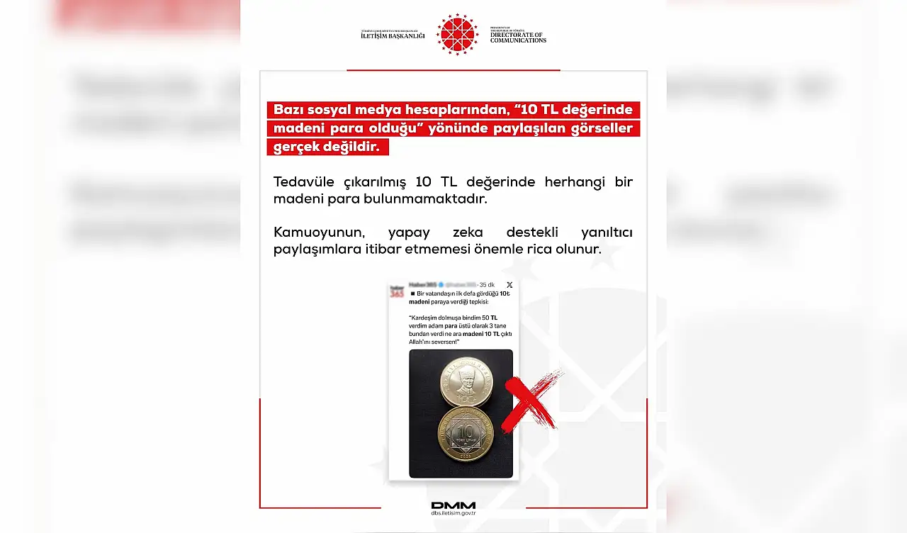 Sosyal medyada son günlerde hızla yayılan "10 TL değerinde madeni para basıldığı" iddialarına, Cumhurbaşkanlığı İletişim Başkanlığı Dezenformasyonla Mücadele Merkezi'nden yalanlama geldi. Yapılan açıklamada, bu tür paylaşımların gerçeği yansıtmadığı vurgulandı.