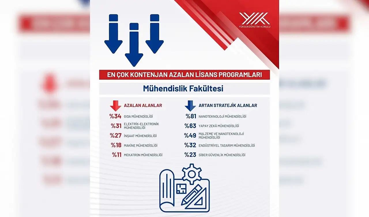 Yükseköğretim Kurulu (YÖK), üniversitelerin mühendislik kontenjanlarında yapılan radikal değişiklikleri paylaştı. Geleneksel mühendislik dallarında kontenjanlar azalırken; Nanoteknoloji, Yapay Zekâ ve Endüstriyel Tasarım Mühendisliği gibi stratejik alanlarda devasa artışlar yaşandığı görüldü. Bu veriler içinde yer alan ve yüzde 32 artış gösteren Endüstriyel Tasarım Mühendisliği, Kayseri'de sadece Erciyes Üniversitesi bünyesinde bulunuyor.