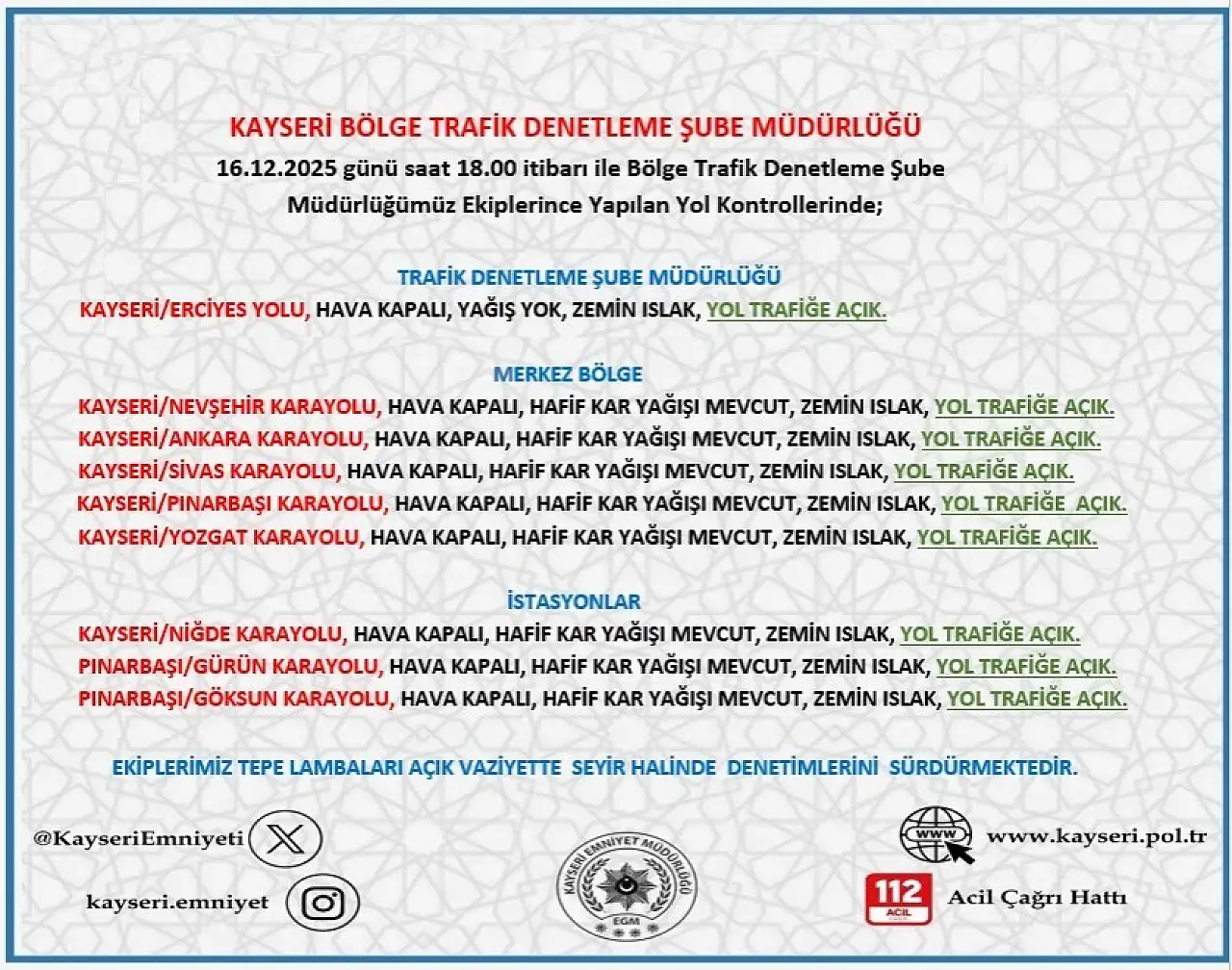 Kayseri Bölge Trafik Denetleme Şube Müdürlüğü tarafından yapılan son yol kontrollerine göre, Kayseri ve çevre yollarında hafif kar yağışı etkili olmasına rağmen tüm güzergahlar trafiğe açık durumda.