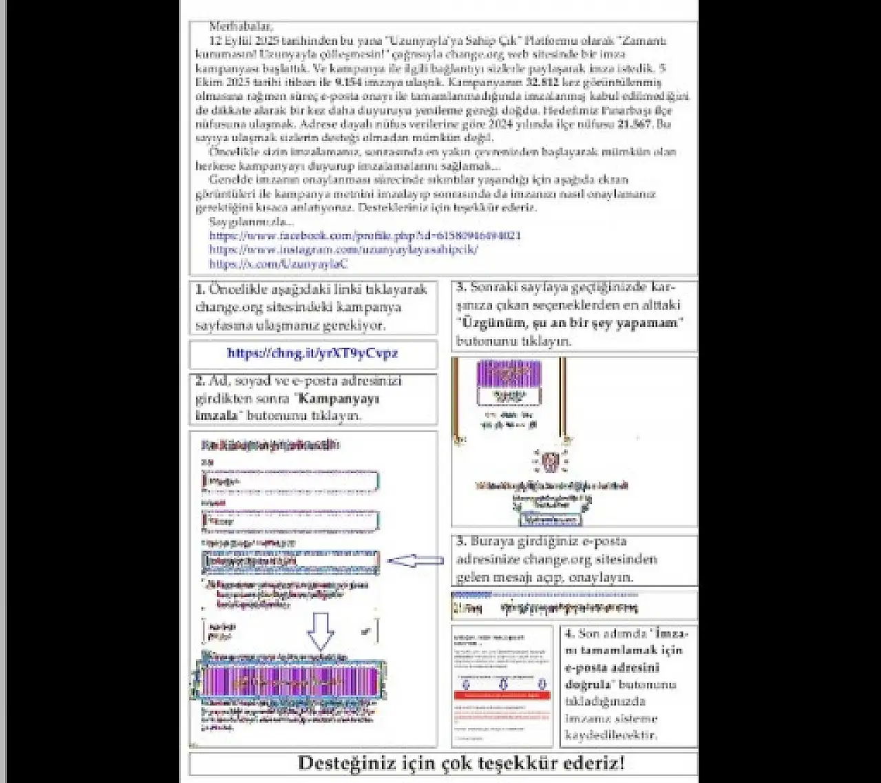 Konuyla ilgili dernekten yapılan açıklamada şu ifadelere yer verildi: "12 Eylül 2025 tarihinden bu yana "Uzunyayla'ya Sahip Çık Platformu olarak "Zamantı kurumasın! Uzunyayla çölleşmesin!" çağrısıyla change.org web sitesinde bir imza kampanyası başlattık. Ve kampanya ile ilgili bağlantıyı sizlerle paylaşarak imza istedik.